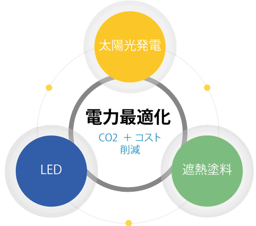 AESCOでは国際的な開発目標SDGsに基づき、日本基準の高効率な太陽光発電システム、LED照明、遮熱塗料等によりCO2とコスト削減の両立で電力を最適化し、将来世代への持続可能な社会への取り組みをお考えの皆様に最適な提案をします。